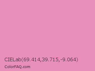 CIELab 69.414,39.715,-9.064 Color is a light rose color and the nearest color is Shocking #e292c0. Hex code #e78ebb and RGB value is rgb(231,142,187). In RGB color space, this color is composed of 91% red, 56% green, 73% blue, In CMYK color space, this color is composed of 0% cyan, 39% magenta, 19% yellow , 9% black , In HSL color space, this color has a hue angle of 330° , 65% saturation and 73% lightness.