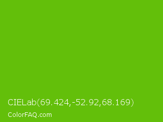 CIELab 69.424,-52.92,68.169 Color is a normal green color and the nearest color is Lima #76bd17. Hex code #63bf0a and RGB value is rgb(99,191,10). In RGB color space, this color is composed of 39% red, 75% green, 4% blue, In CMYK color space, this color is composed of 48% cyan, 0% magenta, 95% yellow , 25% black , In HSL color space, this color has a hue angle of 90° , 90% saturation and 39% lightness.