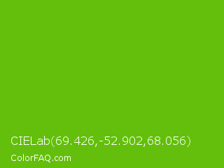 CIELab 69.426,-52.902,68.056 Color is a normal green color and the nearest color is Lima #76bd17. Hex code #63bf0b and RGB value is rgb(99,191,11). In RGB color space, this color is composed of 39% red, 75% green, 4% blue, In CMYK color space, this color is composed of 48% cyan, 0% magenta, 94% yellow , 25% black , In HSL color space, this color has a hue angle of 91° , 89% saturation and 40% lightness.