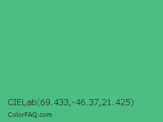CIELab 69.433,-46.37,21.425 Color is a normal green color and the nearest color is Emerald #50c878. Hex code #4cbe81 and RGB value is rgb(76,190,129). In RGB color space, this color is composed of 30% red, 75% green, 51% blue, In CMYK color space, this color is composed of 60% cyan, 0% magenta, 32% yellow , 25% black , In HSL color space, this color has a hue angle of 148° , 47% saturation and 52% lightness.