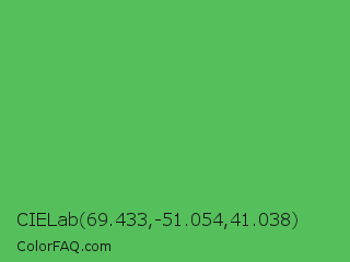 CIELab 69.433,-51.054,41.038 Color is a normal green color and the nearest color is Fern #63b76c. Hex code #55bf5b and RGB value is rgb(85,191,91). In RGB color space, this color is composed of 33% red, 75% green, 36% blue, In CMYK color space, this color is composed of 55% cyan, 0% magenta, 52% yellow , 25% black , In HSL color space, this color has a hue angle of 123° , 45% saturation and 54% lightness.