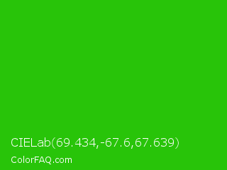 CIELab 69.434,-67.6,67.639 Color is a normal green color and the nearest color is Harlequin Green #46cb18. Hex code #28c409 and RGB value is rgb(40,196,9). In RGB color space, this color is composed of 16% red, 77% green, 4% blue, In CMYK color space, this color is composed of 80% cyan, 0% magenta, 95% yellow , 23% black , In HSL color space, this color has a hue angle of 110° , 91% saturation and 40% lightness.