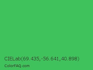 CIELab 69.435,-56.641,40.898 Color is a normal green color and the nearest color is Chateau Green #40a860. Hex code #3fc15b and RGB value is rgb(63,193,91). In RGB color space, this color is composed of 25% red, 76% green, 36% blue, In CMYK color space, this color is composed of 67% cyan, 0% magenta, 53% yellow , 24% black , In HSL color space, this color has a hue angle of 133° , 51% saturation and 50% lightness.