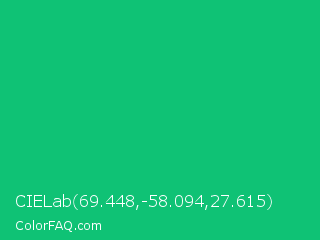 CIELab 69.448,-58.094,27.615 Color is a normal green color and the nearest color is Mountain Meadow Crayola #1ab385. Hex code #0fc275 and RGB value is rgb(15,194,117). In RGB color space, this color is composed of 6% red, 76% green, 46% blue, In CMYK color space, this color is composed of 92% cyan, 0% magenta, 40% yellow , 24% black , In HSL color space, this color has a hue angle of 154° , 86% saturation and 41% lightness.
