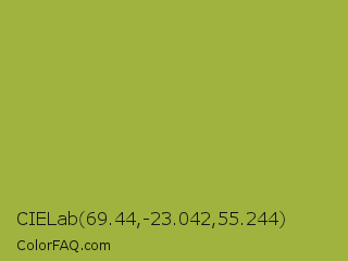 CIELab 69.44,-23.042,55.244 Color is a normal yellow color and the nearest color is Android Green #a4c639. Hex code #9fb33e and RGB value is rgb(159,179,62). In RGB color space, this color is composed of 62% red, 70% green, 24% blue, In CMYK color space, this color is composed of 11% cyan, 0% magenta, 65% yellow , 30% black , In HSL color space, this color has a hue angle of 70° , 49% saturation and 47% lightness.