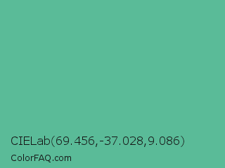 CIELab 69.456,-37.028,9.086 Color is a normal green color and the nearest color is Silver Tree #66b58f. Hex code #5abb98 and RGB value is rgb(90,187,152). In RGB color space, this color is composed of 35% red, 73% green, 60% blue, In CMYK color space, this color is composed of 52% cyan, 0% magenta, 19% yellow , 27% black , In HSL color space, this color has a hue angle of 158° , 42% saturation and 54% lightness.