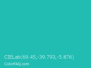 CIELab 69.45,-39.793,-5.876 Color is a normal cyan color and the nearest color is Light Sea Green #20b2aa. Hex code #21bdb3 and RGB value is rgb(33,189,179). In RGB color space, this color is composed of 13% red, 74% green, 70% blue, In CMYK color space, this color is composed of 83% cyan, 0% magenta, 5% yellow , 26% black , In HSL color space, this color has a hue angle of 176° , 70% saturation and 44% lightness.