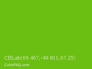 CIELab 69.467,-49.811,67.25 Color is a normal green color and the nearest color is Lima #76bd17. Hex code #6bbe12 and RGB value is rgb(107,190,18). In RGB color space, this color is composed of 42% red, 75% green, 7% blue, In CMYK color space, this color is composed of 44% cyan, 0% magenta, 91% yellow , 25% black , In HSL color space, this color has a hue angle of 89° , 83% saturation and 41% lightness.