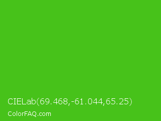 CIELab 69.468,-61.044,65.25 Color is a normal green color and the nearest color is Kelly Green #4cbb17. Hex code #47c21a and RGB value is rgb(71,194,26). In RGB color space, this color is composed of 28% red, 76% green, 10% blue, In CMYK color space, this color is composed of 63% cyan, 0% magenta, 87% yellow , 24% black , In HSL color space, this color has a hue angle of 104° , 76% saturation and 43% lightness.