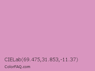 CIELab 69.475,31.853,-11.37 Color is a light magenta color and the nearest color is Shocking #e292c0. Hex code #d995bf and RGB value is rgb(217,149,191). In RGB color space, this color is composed of 85% red, 58% green, 75% blue, In CMYK color space, this color is composed of 0% cyan, 31% magenta, 12% yellow , 15% black , In HSL color space, this color has a hue angle of 323° , 47% saturation and 72% lightness.