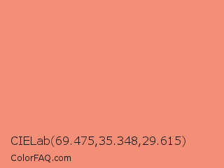 CIELab 69.475,35.348,29.615 Color is a light red color and the nearest color is Apricot #eb9373. Hex code #f38f76 and RGB value is rgb(243,143,118). In RGB color space, this color is composed of 95% red, 56% green, 46% blue, In CMYK color space, this color is composed of 0% cyan, 41% magenta, 51% yellow , 5% black , In HSL color space, this color has a hue angle of 12° , 84% saturation and 71% lightness.