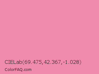 CIELab 69.475,42.367,-1.028 Color is a light rose color and the nearest color is Vanilla Ice #f38fa9. Hex code #f08bad and RGB value is rgb(240,139,173). In RGB color space, this color is composed of 94% red, 55% green, 68% blue, In CMYK color space, this color is composed of 0% cyan, 42% magenta, 28% yellow , 6% black , In HSL color space, this color has a hue angle of 340° , 77% saturation and 74% lightness.