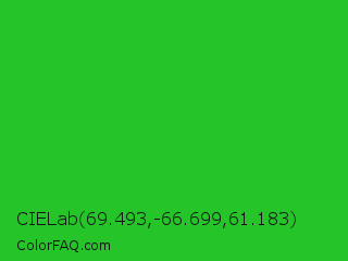 CIELab 69.493,-66.699,61.183 Color is a normal green color and the nearest color is Lime Green #32cd32. Hex code #25c429 and RGB value is rgb(37,196,41). In RGB color space, this color is composed of 15% red, 77% green, 16% blue, In CMYK color space, this color is composed of 81% cyan, 0% magenta, 79% yellow , 23% black , In HSL color space, this color has a hue angle of 122° , 68% saturation and 46% lightness.