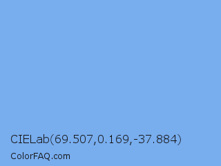 CIELab 69.507,0.169,-37.884 Color is a light blue color and the nearest color is Aero #7cb9e8. Hex code #78adee and RGB value is rgb(120,173,238). In RGB color space, this color is composed of 47% red, 68% green, 93% blue, In CMYK color space, this color is composed of 50% cyan, 27% magenta, 0% yellow , 7% black , In HSL color space, this color has a hue angle of 213° , 78% saturation and 70% lightness.