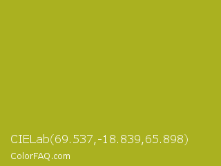 CIELab 69.537,-18.839,65.898 Color is a normal yellow color and the nearest color is Citron #9fa91f. Hex code #aab120 and RGB value is rgb(170,177,32). In RGB color space, this color is composed of 67% red, 69% green, 13% blue, In CMYK color space, this color is composed of 4% cyan, 0% magenta, 82% yellow , 31% black , In HSL color space, this color has a hue angle of 63° , 69% saturation and 41% lightness.