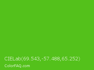 CIELab 69.543,-57.488,65.252 Color is a normal green color and the nearest color is Kelly Green #4cbb17. Hex code #54c11b and RGB value is rgb(84,193,27). In RGB color space, this color is composed of 33% red, 76% green, 11% blue, In CMYK color space, this color is composed of 56% cyan, 0% magenta, 86% yellow , 24% black , In HSL color space, this color has a hue angle of 99° , 75% saturation and 43% lightness.