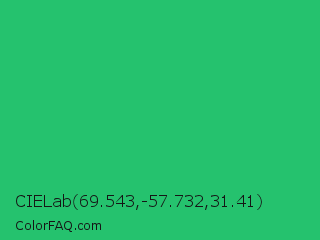 CIELab 69.543,-57.732,31.41 Color is a normal green color and the nearest color is Green Crayola #1cac78. Hex code #25c26e and RGB value is rgb(37,194,110). In RGB color space, this color is composed of 15% red, 76% green, 43% blue, In CMYK color space, this color is composed of 81% cyan, 0% magenta, 43% yellow , 24% black , In HSL color space, this color has a hue angle of 148° , 68% saturation and 45% lightness.