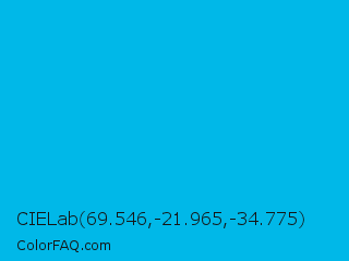 CIELab 69.546,-21.965,-34.775 Color is a normal cyan color and the nearest color is Cyan Process #00b7eb. Hex code #00b8e8 and RGB value is rgb(0,184,232). In RGB color space, this color is composed of 0% red, 72% green, 91% blue, In CMYK color space, this color is composed of 100% cyan, 21% magenta, 0% yellow , 9% black , In HSL color space, this color has a hue angle of 192° , 100% saturation and 45% lightness.
