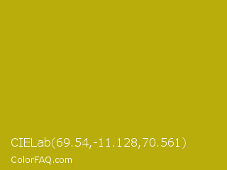 CIELab 69.54,-11.128,70.561 Color is a normal yellow color and the nearest color is Sahara #b7a214. Hex code #b8ad0a and RGB value is rgb(184,173,10). In RGB color space, this color is composed of 72% red, 68% green, 4% blue, In CMYK color space, this color is composed of 0% cyan, 6% magenta, 95% yellow , 28% black , In HSL color space, this color has a hue angle of 56° , 90% saturation and 38% lightness.