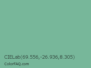 CIELab 69.556,-26.936,8.305 Color is a normal green color and the nearest color is Acapulco #7cb0a1. Hex code #77b79a and RGB value is rgb(119,183,154). In RGB color space, this color is composed of 47% red, 72% green, 60% blue, In CMYK color space, this color is composed of 35% cyan, 0% magenta, 16% yellow , 28% black , In HSL color space, this color has a hue angle of 153° , 31% saturation and 59% lightness.