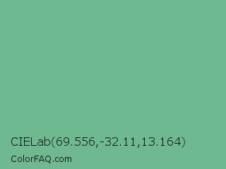 CIELab 69.556,-32.11,13.164 Color is a normal green color and the nearest color is Silver Tree #66b58f. Hex code #6fb991 and RGB value is rgb(111,185,145). In RGB color space, this color is composed of 44% red, 73% green, 57% blue, In CMYK color space, this color is composed of 40% cyan, 0% magenta, 22% yellow , 27% black , In HSL color space, this color has a hue angle of 148° , 35% saturation and 58% lightness.