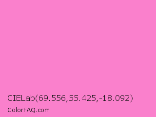 CIELab 69.556,55.425,-18.092 Color is a light magenta color and the nearest color is Princess Perfume #ff85cf. Hex code #fa80cc and RGB value is rgb(250,128,204). In RGB color space, this color is composed of 98% red, 50% green, 80% blue, In CMYK color space, this color is composed of 0% cyan, 49% magenta, 18% yellow , 2% black , In HSL color space, this color has a hue angle of 323° , 92% saturation and 74% lightness.
