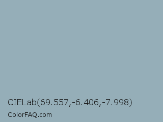 CIELab 69.557,-6.406,-7.998 Color is a light blue color and the nearest color is Gull Gray #9dacb7. Hex code #95aeb8 and RGB value is rgb(149,174,184). In RGB color space, this color is composed of 58% red, 68% green, 72% blue, In CMYK color space, this color is composed of 19% cyan, 5% magenta, 0% yellow , 28% black , In HSL color space, this color has a hue angle of 197° , 20% saturation and 65% lightness.