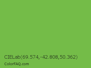 CIELab 69.574,-42.808,50.362 Color is a normal green color and the nearest color is Bud Green #7bb661. Hex code #74bc48 and RGB value is rgb(116,188,72). In RGB color space, this color is composed of 45% red, 74% green, 28% blue, In CMYK color space, this color is composed of 38% cyan, 0% magenta, 62% yellow , 26% black , In HSL color space, this color has a hue angle of 97° , 46% saturation and 51% lightness.