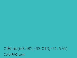 CIELab 69.582,-33.019,-11.676 Color is a normal cyan color and the nearest color is Maximum Blue Green #30bfbf. Hex code #3abbbe and RGB value is rgb(58,187,190). In RGB color space, this color is composed of 23% red, 73% green, 75% blue, In CMYK color space, this color is composed of 69% cyan, 2% magenta, 0% yellow , 25% black , In HSL color space, this color has a hue angle of 181° , 53% saturation and 49% lightness.