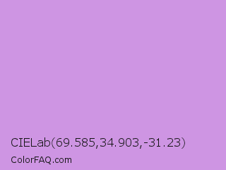 CIELab 69.585,34.903,-31.23 Color is a light purple color and the nearest color is Bright Ube #d19fe8. Hex code #ce95e3 and RGB value is rgb(206,149,227). In RGB color space, this color is composed of 81% red, 58% green, 89% blue, In CMYK color space, this color is composed of 9% cyan, 34% magenta, 0% yellow , 11% black , In HSL color space, this color has a hue angle of 284° , 58% saturation and 74% lightness.