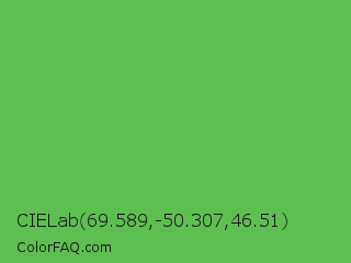 CIELab 69.589,-50.307,46.51 Color is a normal green color and the nearest color is Fern #63b76c. Hex code #5dbf50 and RGB value is rgb(93,191,80). In RGB color space, this color is composed of 36% red, 75% green, 31% blue, In CMYK color space, this color is composed of 51% cyan, 0% magenta, 58% yellow , 25% black , In HSL color space, this color has a hue angle of 113° , 46% saturation and 53% lightness.