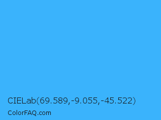 CIELab 69.589,-9.055,-45.522 Color is a light blue color and the nearest color is Picton Blue #45b1e8. Hex code #3ab3fc and RGB value is rgb(58,179,252). In RGB color space, this color is composed of 23% red, 70% green, 99% blue, In CMYK color space, this color is composed of 77% cyan, 29% magenta, 0% yellow , 1% black , In HSL color space, this color has a hue angle of 203° , 97% saturation and 61% lightness.