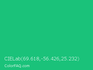CIELab 69.618,-56.426,25.232 Color is a normal green color and the nearest color is Mountain Meadow Crayola #1ab385. Hex code #1ac27a and RGB value is rgb(26,194,122). In RGB color space, this color is composed of 10% red, 76% green, 48% blue, In CMYK color space, this color is composed of 87% cyan, 0% magenta, 37% yellow , 24% black , In HSL color space, this color has a hue angle of 154° , 76% saturation and 43% lightness.