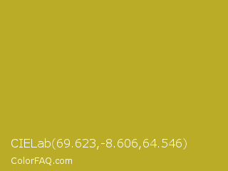 CIELab 69.623,-8.606,64.546 Color is a normal yellow color and the nearest color is Hokey Pokey #c8a528. Hex code #bbac27 and RGB value is rgb(187,172,39). In RGB color space, this color is composed of 73% red, 67% green, 15% blue, In CMYK color space, this color is composed of 0% cyan, 8% magenta, 79% yellow , 27% black , In HSL color space, this color has a hue angle of 54° , 65% saturation and 44% lightness.