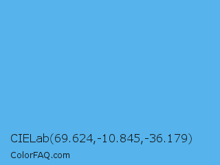 CIELab 69.624,-10.845,-36.179 Color is a light blue color and the nearest color is Blue Jeans #5dadec. Hex code #56b3eb and RGB value is rgb(86,179,235). In RGB color space, this color is composed of 34% red, 70% green, 92% blue, In CMYK color space, this color is composed of 63% cyan, 24% magenta, 0% yellow , 8% black , In HSL color space, this color has a hue angle of 203° , 79% saturation and 63% lightness.