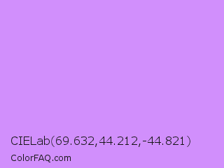 CIELab 69.632,44.212,-44.821 Color is a light purple color and the nearest color is Pale Violet #cc99ff. Hex code #d18ffc and RGB value is rgb(209,143,252). In RGB color space, this color is composed of 82% red, 56% green, 99% blue, In CMYK color space, this color is composed of 17% cyan, 43% magenta, 0% yellow , 1% black , In HSL color space, this color has a hue angle of 276° , 95% saturation and 77% lightness.