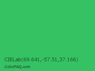 CIELab 69.641,-57.51,37.166 Color is a normal green color and the nearest color is UFO Green #3cd070. Hex code #35c263 and RGB value is rgb(53,194,99). In RGB color space, this color is composed of 21% red, 76% green, 39% blue, In CMYK color space, this color is composed of 73% cyan, 0% magenta, 49% yellow , 24% black , In HSL color space, this color has a hue angle of 140° , 57% saturation and 48% lightness.