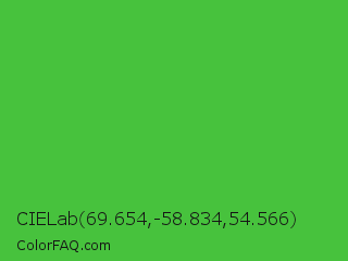 CIELab 69.654,-58.834,54.566 Color is a normal green color and the nearest color is Lime Green #32cd32. Hex code #47c23d and RGB value is rgb(71,194,61). In RGB color space, this color is composed of 28% red, 76% green, 24% blue, In CMYK color space, this color is composed of 63% cyan, 0% magenta, 69% yellow , 24% black , In HSL color space, this color has a hue angle of 115° , 52% saturation and 50% lightness.