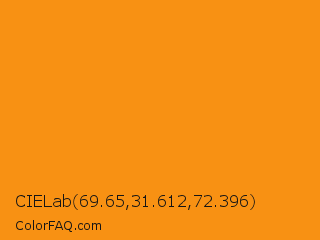 CIELab 69.65,31.612,72.396 Color is a normal orange color and the nearest color is West Side #ff910f. Hex code #f89113 and RGB value is rgb(248,145,19). In RGB color space, this color is composed of 97% red, 57% green, 7% blue, In CMYK color space, this color is composed of 0% cyan, 42% magenta, 92% yellow , 3% black , In HSL color space, this color has a hue angle of 33° , 94% saturation and 52% lightness.