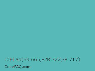 CIELab 69.665,-28.322,-8.717 Color is a normal cyan color and the nearest color is Fountain Blue #56b4be. Hex code #58b9b9 and RGB value is rgb(88,185,185). In RGB color space, this color is composed of 35% red, 73% green, 73% blue, In CMYK color space, this color is composed of 52% cyan, 0% magenta, 0% yellow , 27% black , In HSL color space, this color has a hue angle of 180° , 41% saturation and 54% lightness.