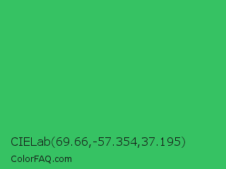 CIELab 69.66,-57.354,37.195 Color is a normal green color and the nearest color is UFO Green #3cd070. Hex code #36c263 and RGB value is rgb(54,194,99). In RGB color space, this color is composed of 21% red, 76% green, 39% blue, In CMYK color space, this color is composed of 72% cyan, 0% magenta, 49% yellow , 24% black , In HSL color space, this color has a hue angle of 139° , 56% saturation and 49% lightness.