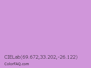 CIELab 69.672,33.202,-26.122 Color is a light purple color and the nearest color is Light Wisteria #c9a0dc. Hex code #d096da and RGB value is rgb(208,150,218). In RGB color space, this color is composed of 82% red, 59% green, 85% blue, In CMYK color space, this color is composed of 5% cyan, 31% magenta, 0% yellow , 15% black , In HSL color space, this color has a hue angle of 291° , 48% saturation and 72% lightness.