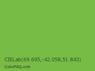 CIELab 69.695,-42.058,51.843 Color is a normal green color and the nearest color is Sushi #87ab39. Hex code #77bc45 and RGB value is rgb(119,188,69). In RGB color space, this color is composed of 47% red, 74% green, 27% blue, In CMYK color space, this color is composed of 37% cyan, 0% magenta, 63% yellow , 26% black , In HSL color space, this color has a hue angle of 95° , 47% saturation and 50% lightness.