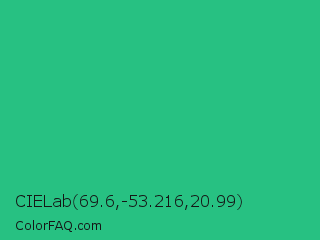 CIELab 69.6,-53.216,20.99 Color is a normal green color and the nearest color is Mountain Meadow #30ba8f. Hex code #27c182 and RGB value is rgb(39,193,130). In RGB color space, this color is composed of 15% red, 76% green, 51% blue, In CMYK color space, this color is composed of 80% cyan, 0% magenta, 33% yellow , 24% black , In HSL color space, this color has a hue angle of 155° , 66% saturation and 45% lightness.