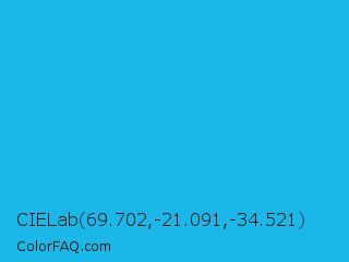 CIELab 69.702,-21.091,-34.521 Color is a normal blue color and the nearest color is Battery Charged Blue #1dacd6. Hex code #1ab8e8 and RGB value is rgb(26,184,232). In RGB color space, this color is composed of 10% red, 72% green, 91% blue, In CMYK color space, this color is composed of 89% cyan, 21% magenta, 0% yellow , 9% black , In HSL color space, this color has a hue angle of 194° , 82% saturation and 51% lightness.