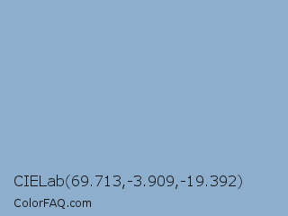 CIELab 69.713,-3.909,-19.392 Color is a light blue color and the nearest color is Polo Blue #8da8cc. Hex code #8daecd and RGB value is rgb(141,174,205). In RGB color space, this color is composed of 55% red, 68% green, 80% blue, In CMYK color space, this color is composed of 31% cyan, 15% magenta, 0% yellow , 20% black , In HSL color space, this color has a hue angle of 209° , 39% saturation and 68% lightness.