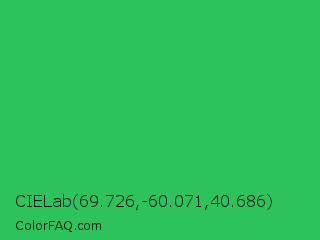 CIELab 69.726,-60.071,40.686 Color is a normal green color and the nearest color is UFO Green #3cd070. Hex code #2dc35c and RGB value is rgb(45,195,92). In RGB color space, this color is composed of 18% red, 76% green, 36% blue, In CMYK color space, this color is composed of 77% cyan, 0% magenta, 53% yellow , 24% black , In HSL color space, this color has a hue angle of 139° , 63% saturation and 47% lightness.