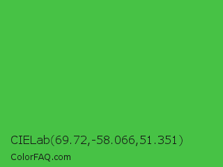 CIELab 69.72,-58.066,51.351 Color is a normal green color and the nearest color is Apple #4fa83d. Hex code #47c245 and RGB value is rgb(71,194,69). In RGB color space, this color is composed of 28% red, 76% green, 27% blue, In CMYK color space, this color is composed of 63% cyan, 0% magenta, 64% yellow , 24% black , In HSL color space, this color has a hue angle of 119° , 51% saturation and 52% lightness.
