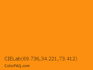 CIELab 69.736,34.221,73.412 Color is a normal orange color and the nearest color is West Side #ff910f. Hex code #fc8f0f and RGB value is rgb(252,143,15). In RGB color space, this color is composed of 99% red, 56% green, 6% blue, In CMYK color space, this color is composed of 0% cyan, 43% magenta, 94% yellow , 1% black , In HSL color space, this color has a hue angle of 32° , 98% saturation and 52% lightness.