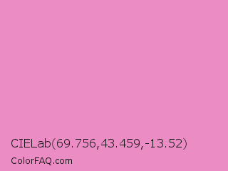 CIELab 69.756,43.459,-13.52 Color is a light magenta color and the nearest color is Shocking #e292c0. Hex code #eb8cc4 and RGB value is rgb(235,140,196). In RGB color space, this color is composed of 92% red, 55% green, 77% blue, In CMYK color space, this color is composed of 0% cyan, 40% magenta, 17% yellow , 8% black , In HSL color space, this color has a hue angle of 325° , 70% saturation and 74% lightness.